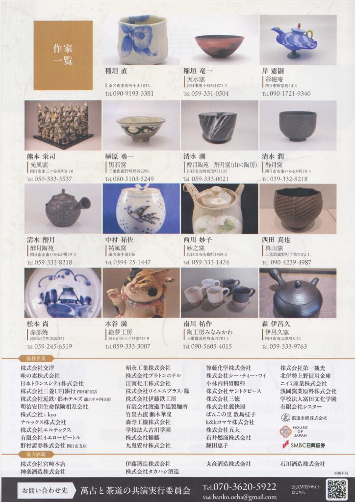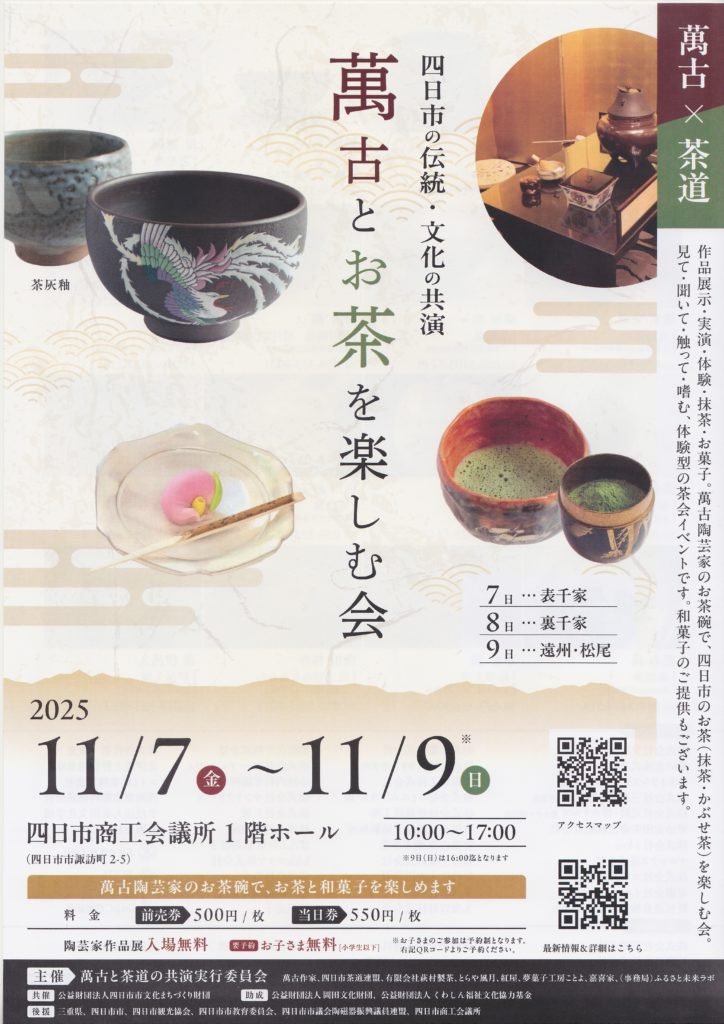 遅すぎる宣伝 2025年11月8日 つれづれ 遅すぎる宣伝をします。 でもまだ間に合います。 11月7日〜9日で四日市商工会議所にて「萬古とお茶を楽しむ会」が開かれています。 今このブログは8日の朝書いていますのでまだ2日あります。 よろしければ是非ともご高覧下さいませ。 よろしくお願いします。