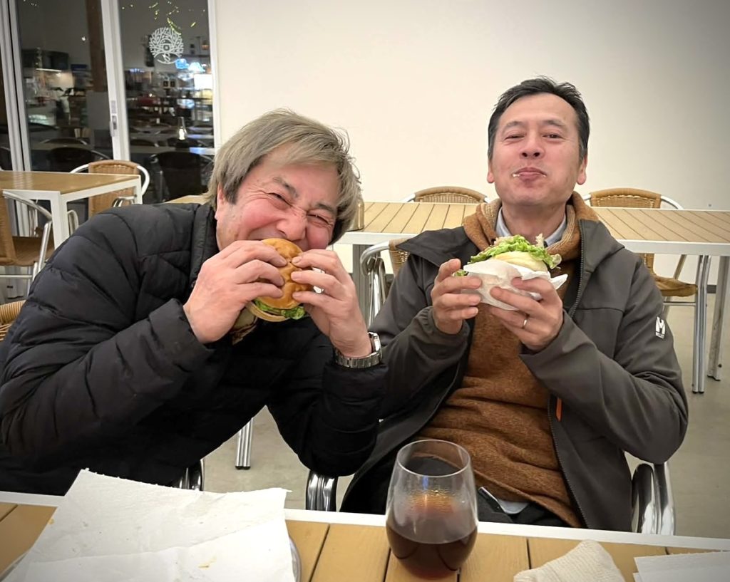 写真が何もないので先日の真冬のBBQで友人とハンバーガーと